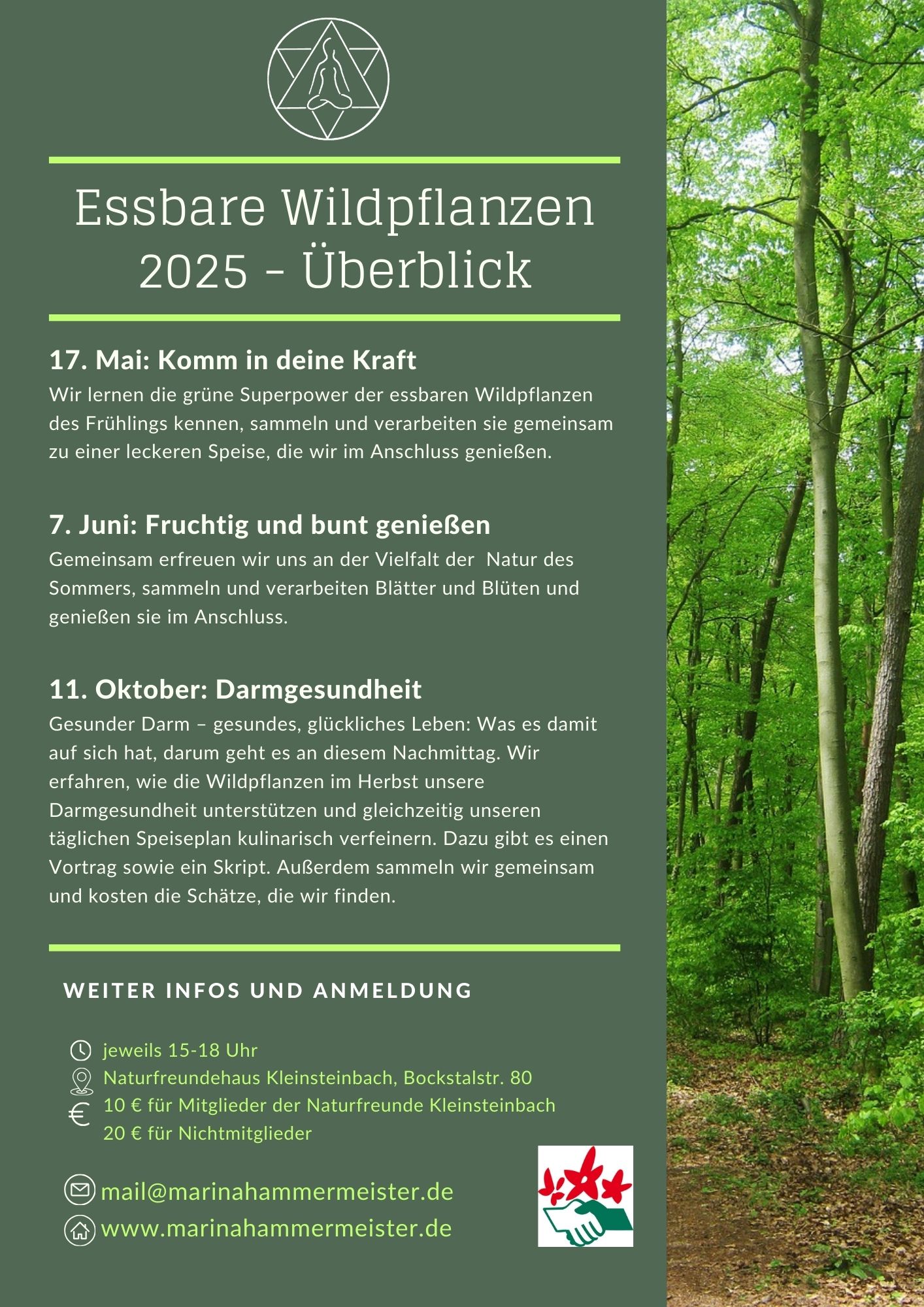 Als ausgebildete Fachberaterin für Selbstversorgung mit essbaren Wildpflanzen biete ich Verschiedenes zum Thema an. Wenn du interessiert bist, dann schau gerne immer wieder hier vorbei. Alle aktuellen Termine kannst du auf dieser Homepage finden. Gerne könne wir auch individuelle Termine für Wildpflanzenführungen oder Vorträge zu gezielten Themen ausmachen.